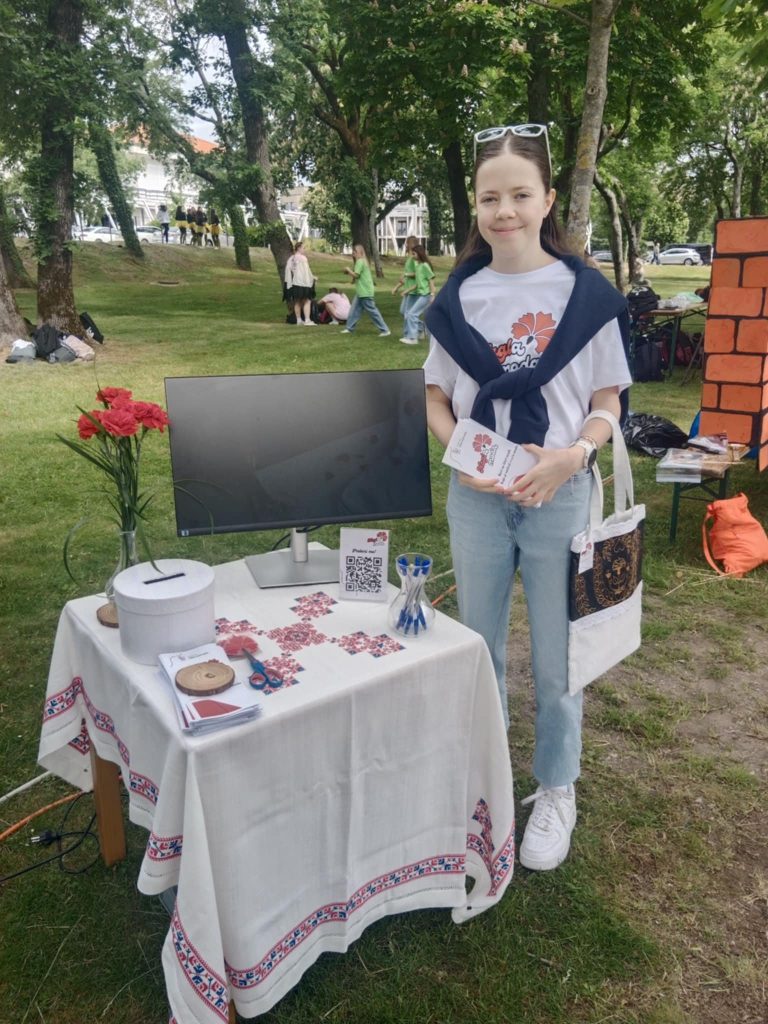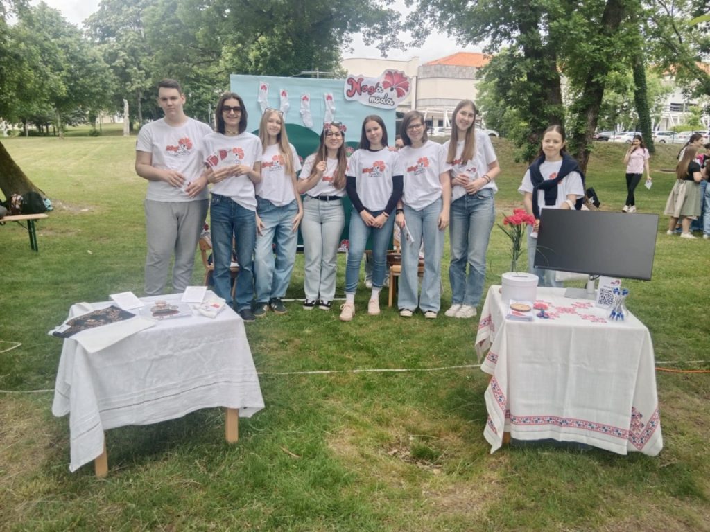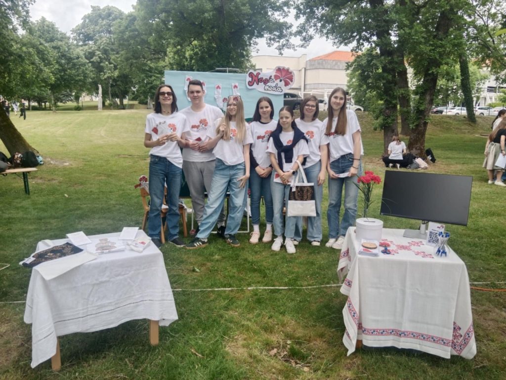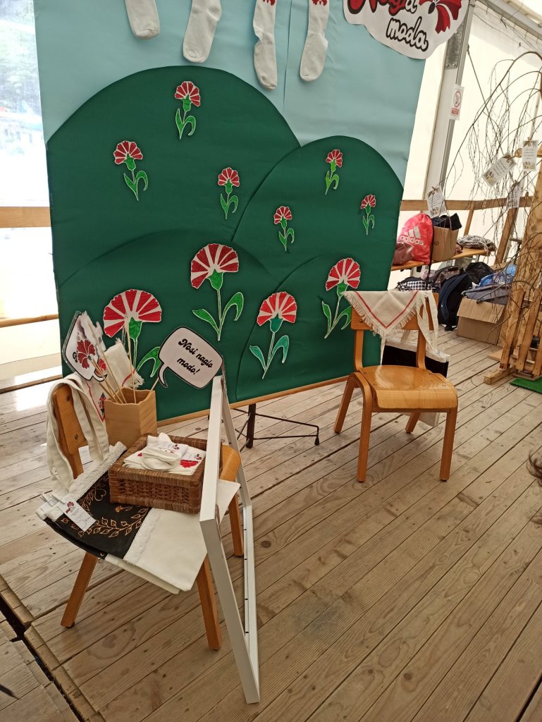 Tako sta nastala naša produkta: modne bele nogavice s posodobljenim motivom rdečega nageljna in tekstilna vrečka po podobi avbe. Modno linijo smo poimenovali Nagla moda. Oblikovali smo tudi načrt trženja produktov, posneli promocijski spot ter izdelali stojnico in promocijski material.