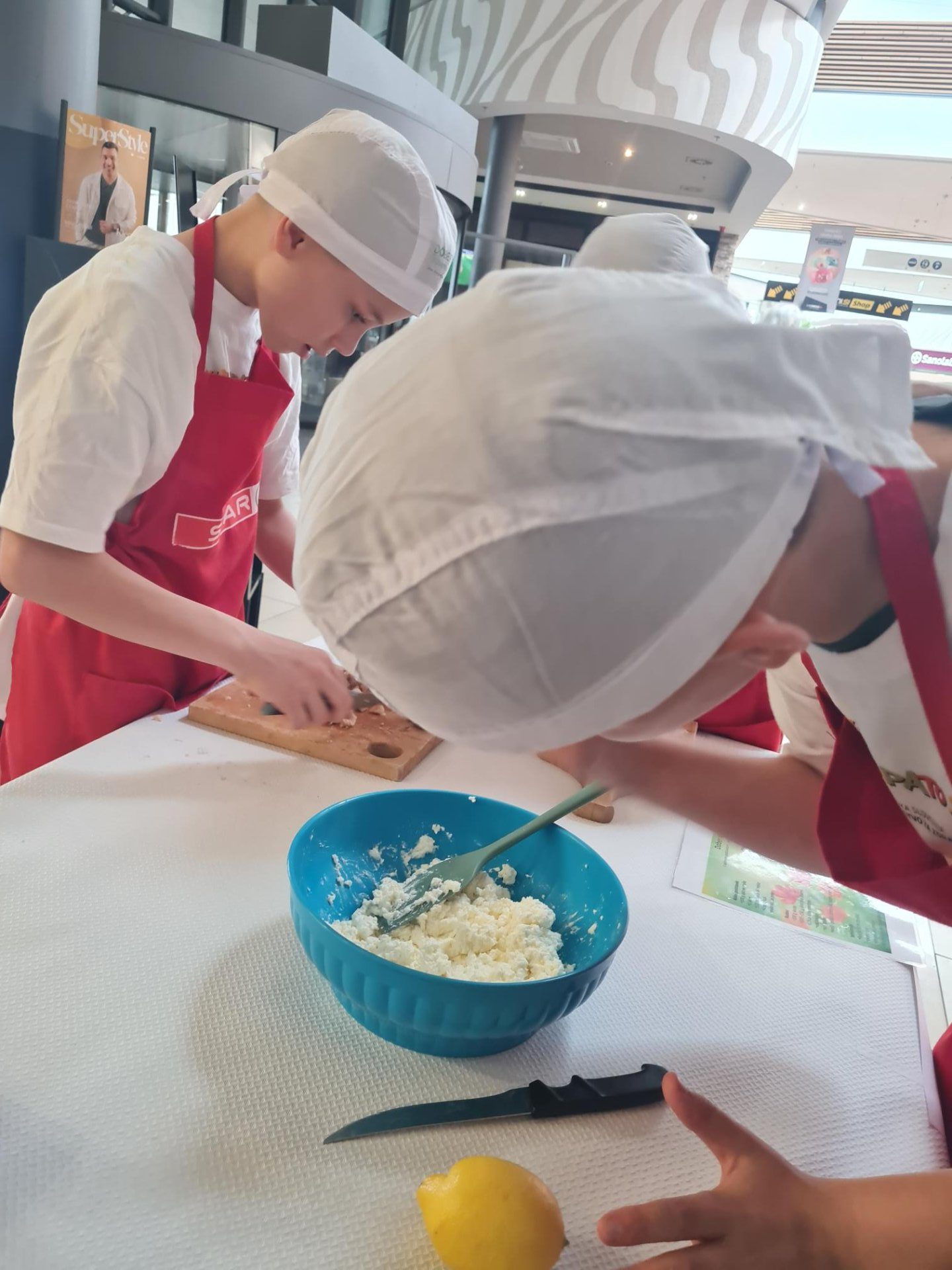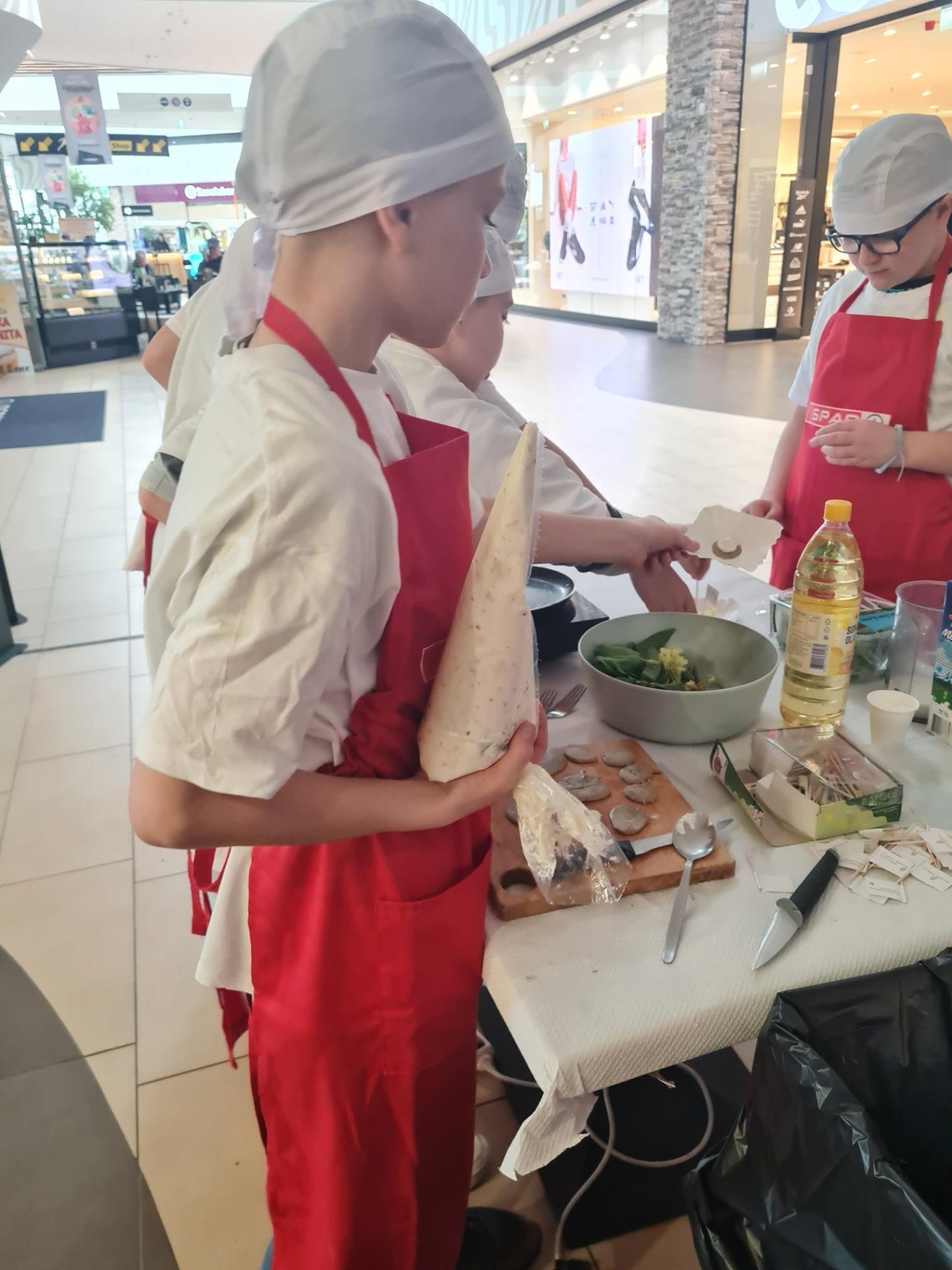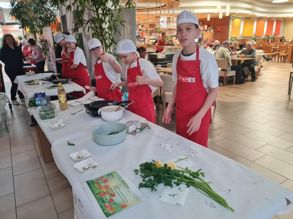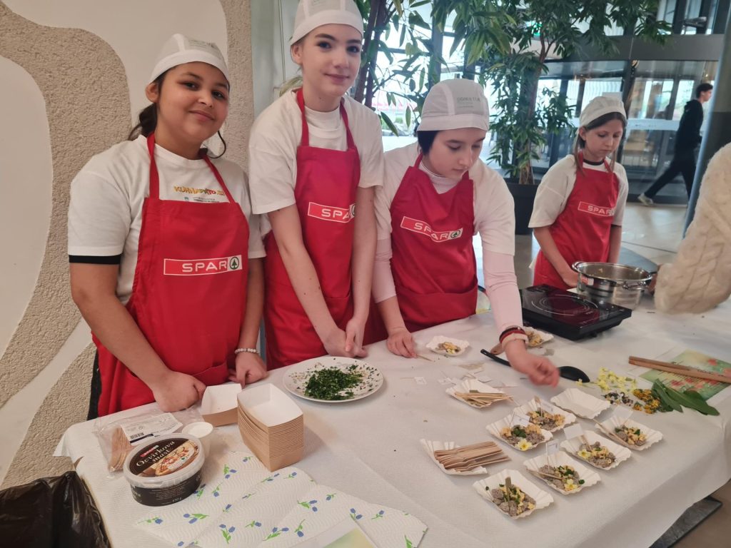 V sodelovanju s projektom »Kuhna pa to« učenci pripravljali tradicionalno gorenjsko jed Jurjeva kapa in Ajdov spomladanski zavitek s skutnim nadevom iz prekajene postrvi v Intersparu Supernova Kranj