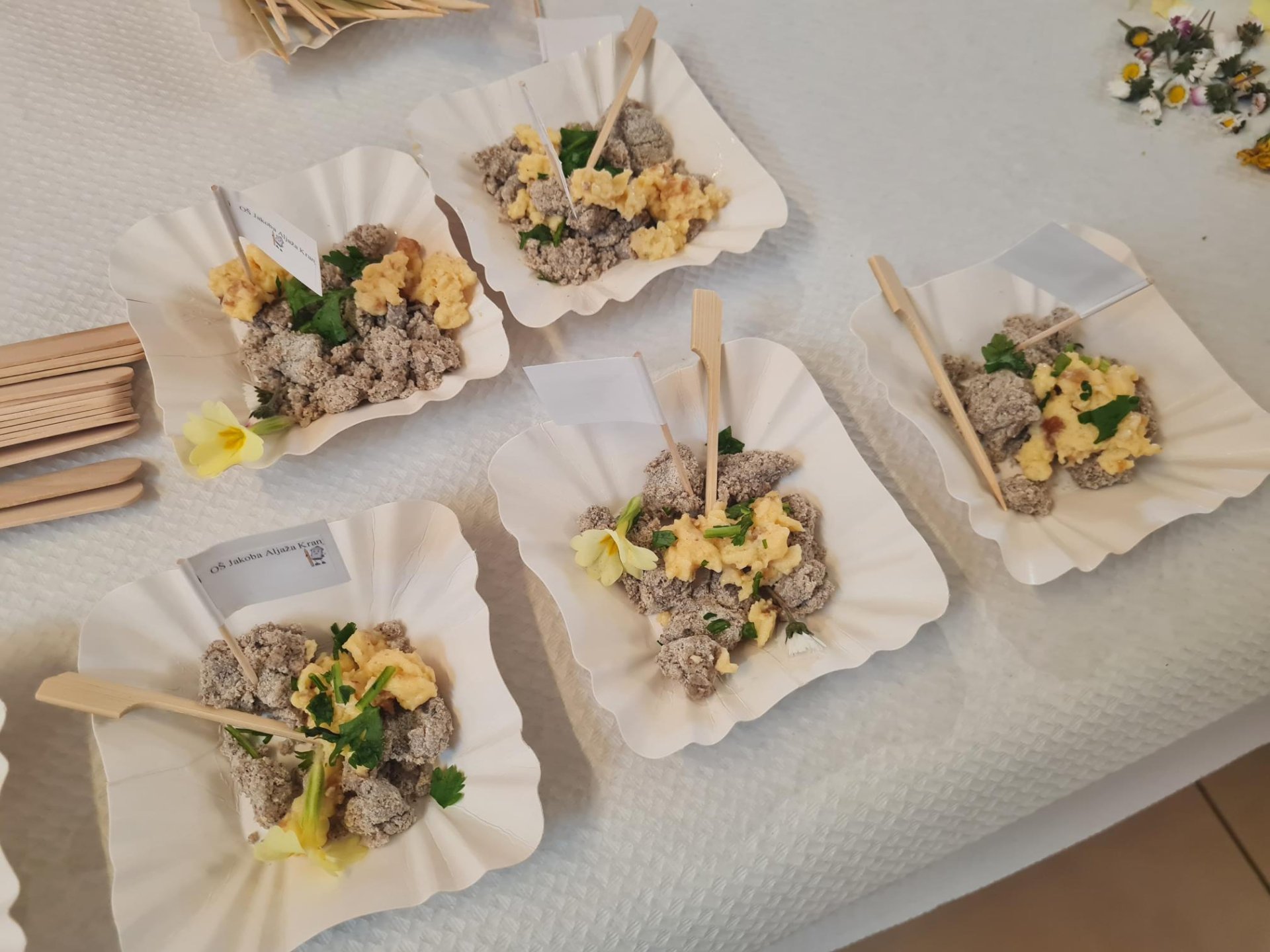 Učenci so s svojo iznajdljivostjo in »kuharijo« obiskovalcem postregli jedi, ki so redkokdaj na jedilniku, z veseljem pa so jim razložili tudi sam postopek priprave in kulinarični pomen. Za lep izgled so dodali tudi domača zelišča in okrasili s pisanimi spomladanskimi cvetlicami, ki smo jih nabrali na travniku.