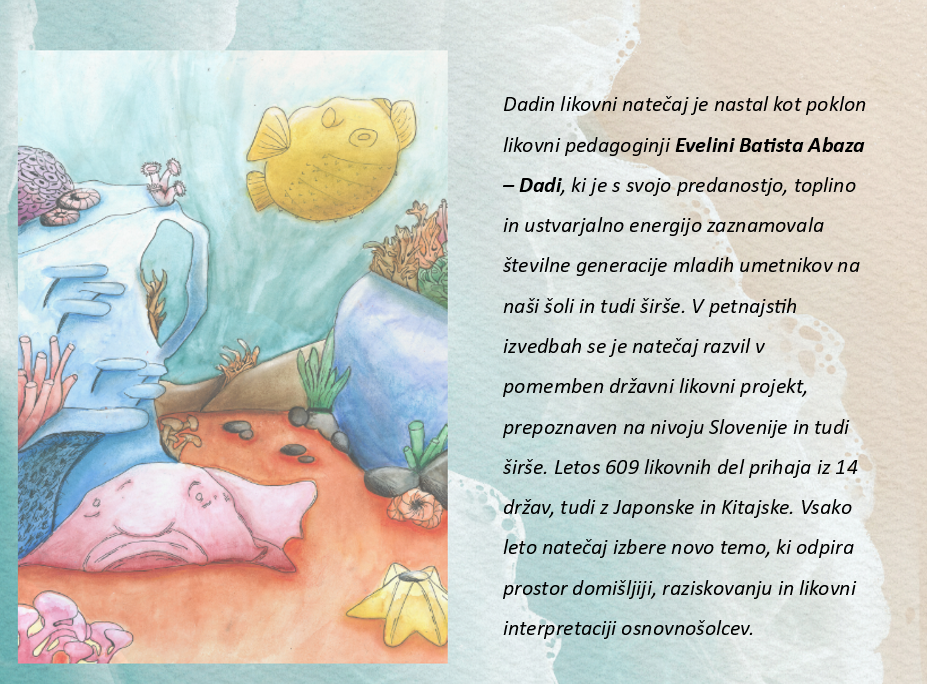 Na Osnovni šoli Jakoba Aljaža Kranj smo ponosni na dragoceno dediščino naše učiteljice akademske slikarke Eveline Batista Abaza – Dade, ki se je pred 45 leti kot prva učiteljica likovne vzgoje zaposlila na naši šoli in s svojo predanostjo, umetniško širino in toplino tlakovala pot likovnemu ustvarjanju številnih generacij otrok. Letos mineva 19 let, odkar se je poslovila, a njena navdihujoča prisotnost med nami ostaja živa – prav skozi ta natečaj, ki nosi njeno ime. Ob tem se zagotovo vsi kdaj vprašamo, kaj bi Dada kot izkušena slikarka in pozorna opazovalka rekla na letošnje stvaritve. Kaj bi povedala o njihovi likovni sporočilnosti, barvni govorici, izrazu in duši, ki jo nosijo?