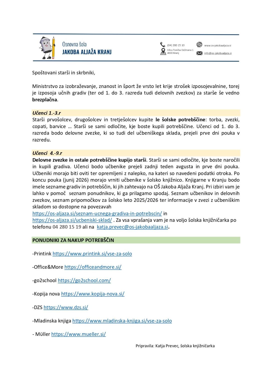 Seznam učbenikov in delovnih zvezkov za šolsko leto 2025/2026 in seznam potrebščin