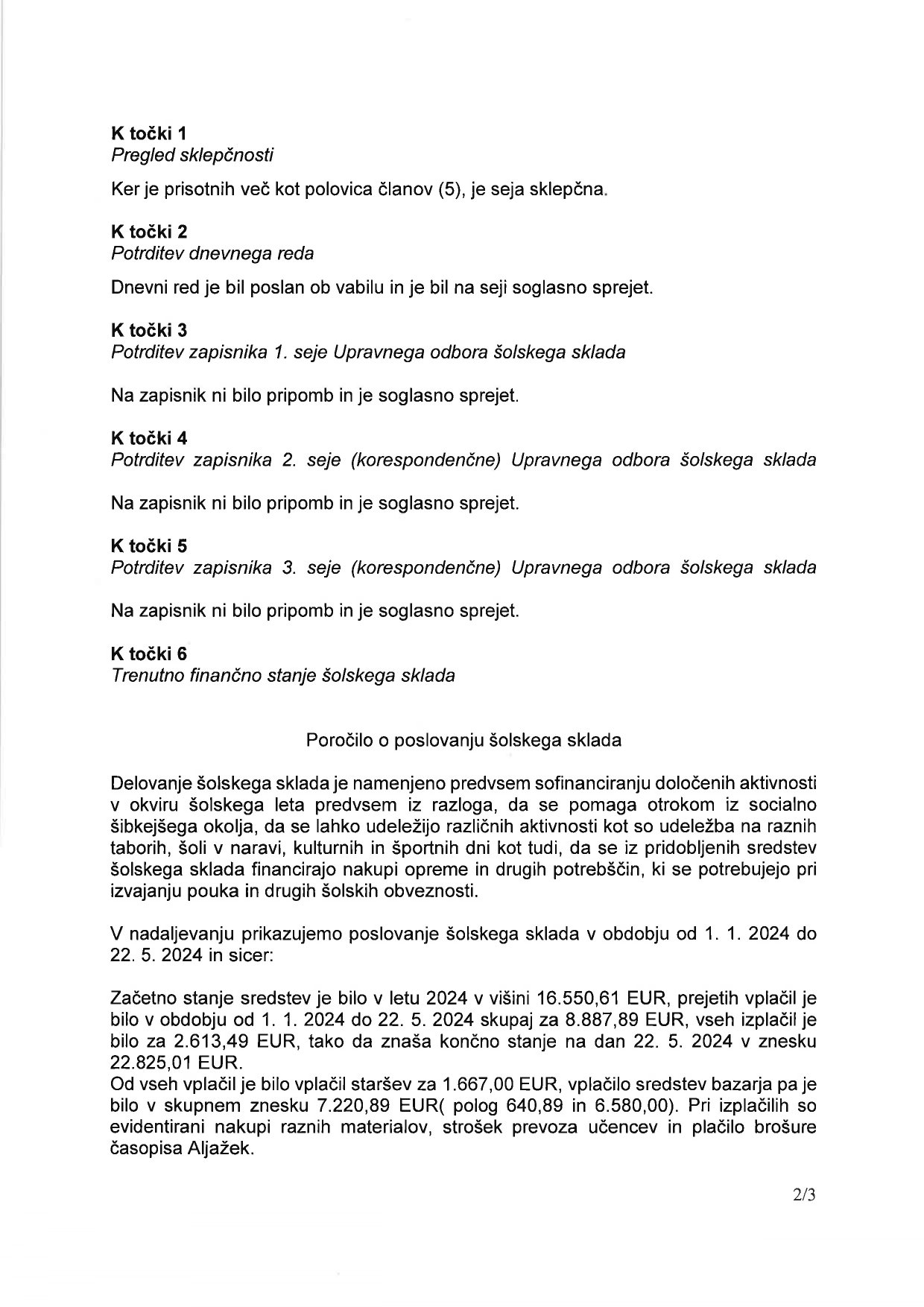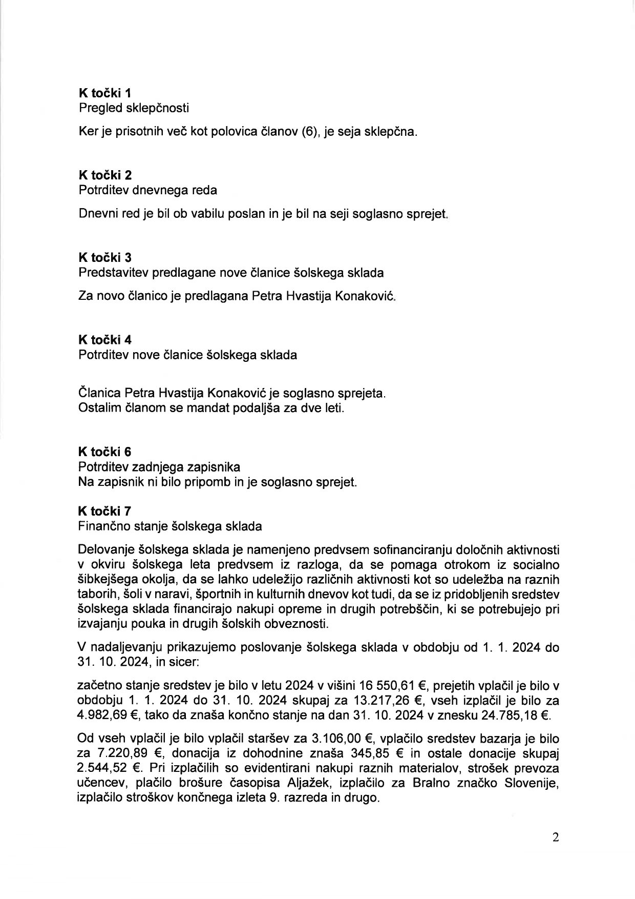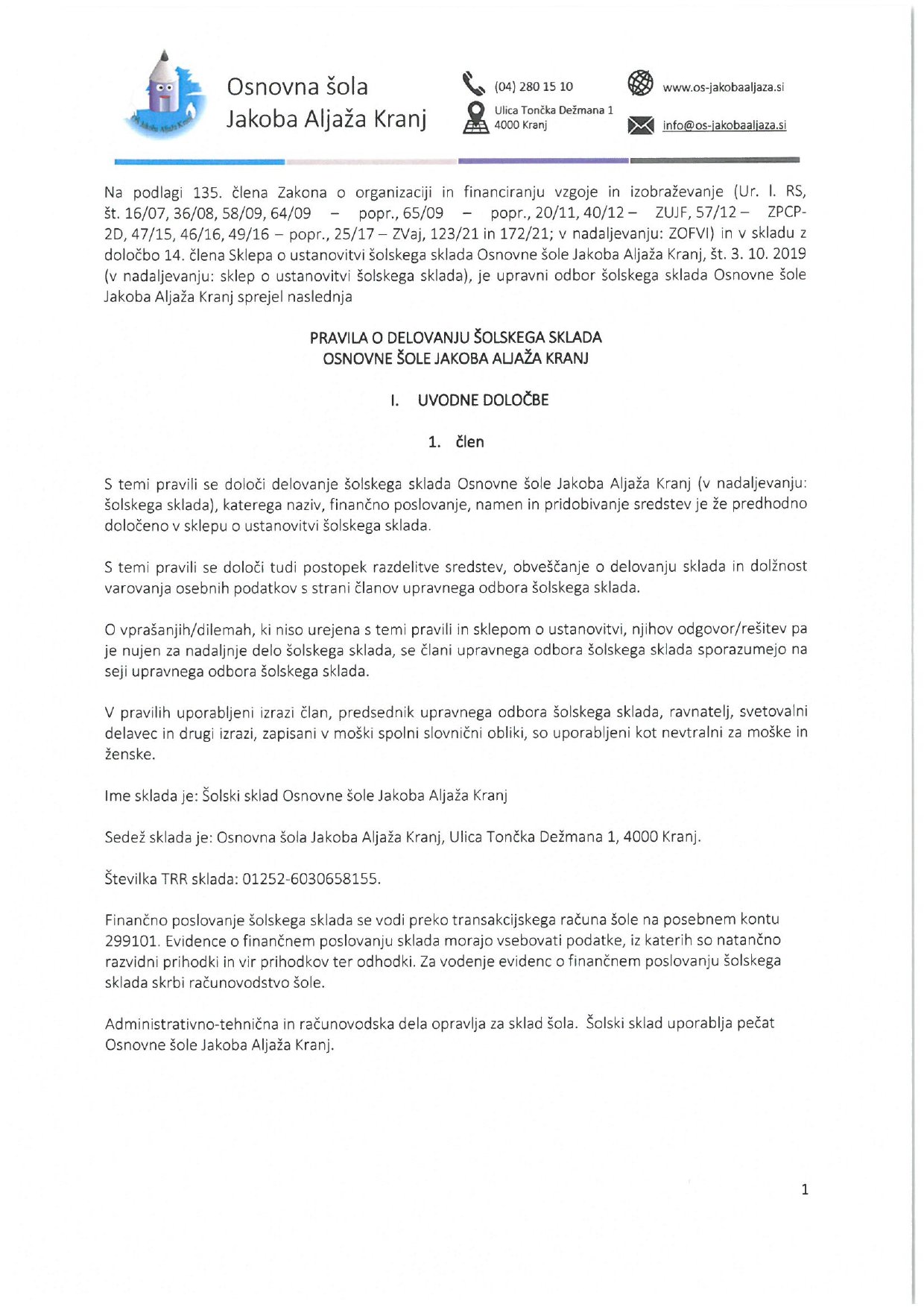 Šolski sklad je bil ustanovljen konec leta 2006. Iz Šolskega sklada se na podlagi 135. člena Zakona o organizaciji in financiranju vzgoje in izobraževanja financirajo dejavnosti posameznega razreda, ki niso sestavni del izobraževalnega programa, oziroma se ne financirajo iz javnih sredstev.