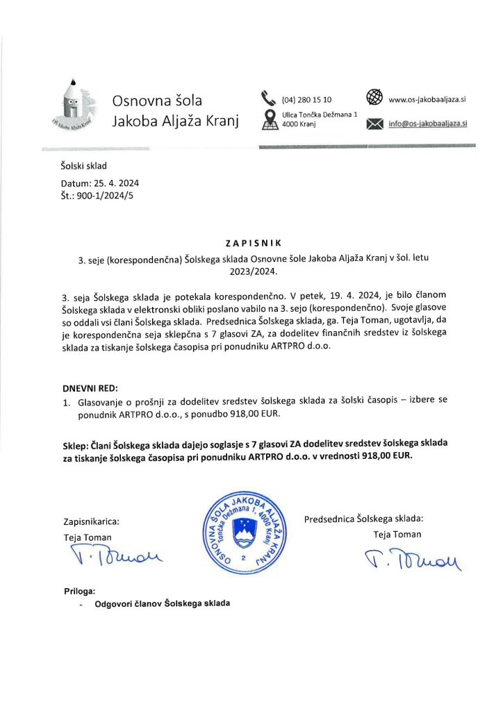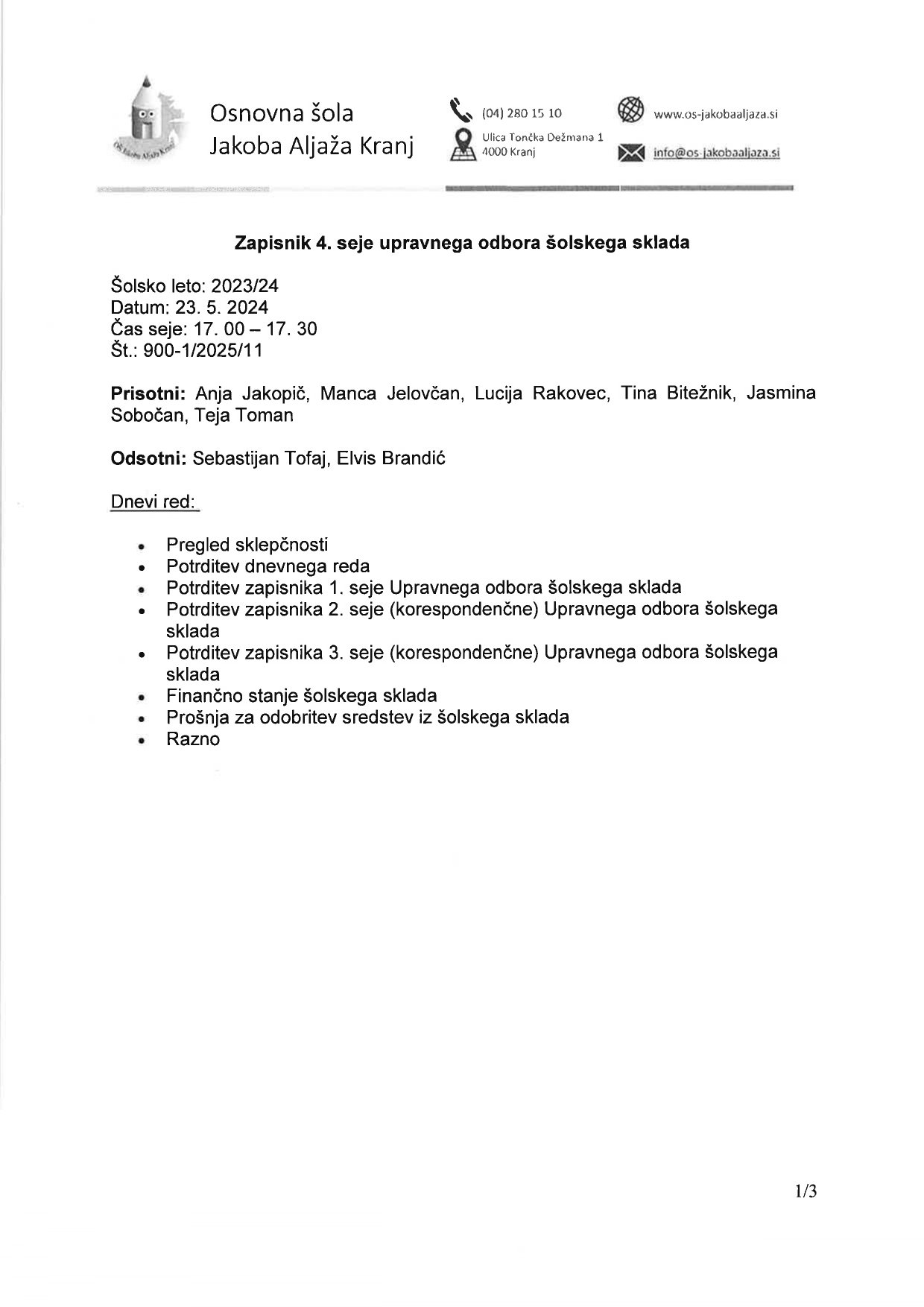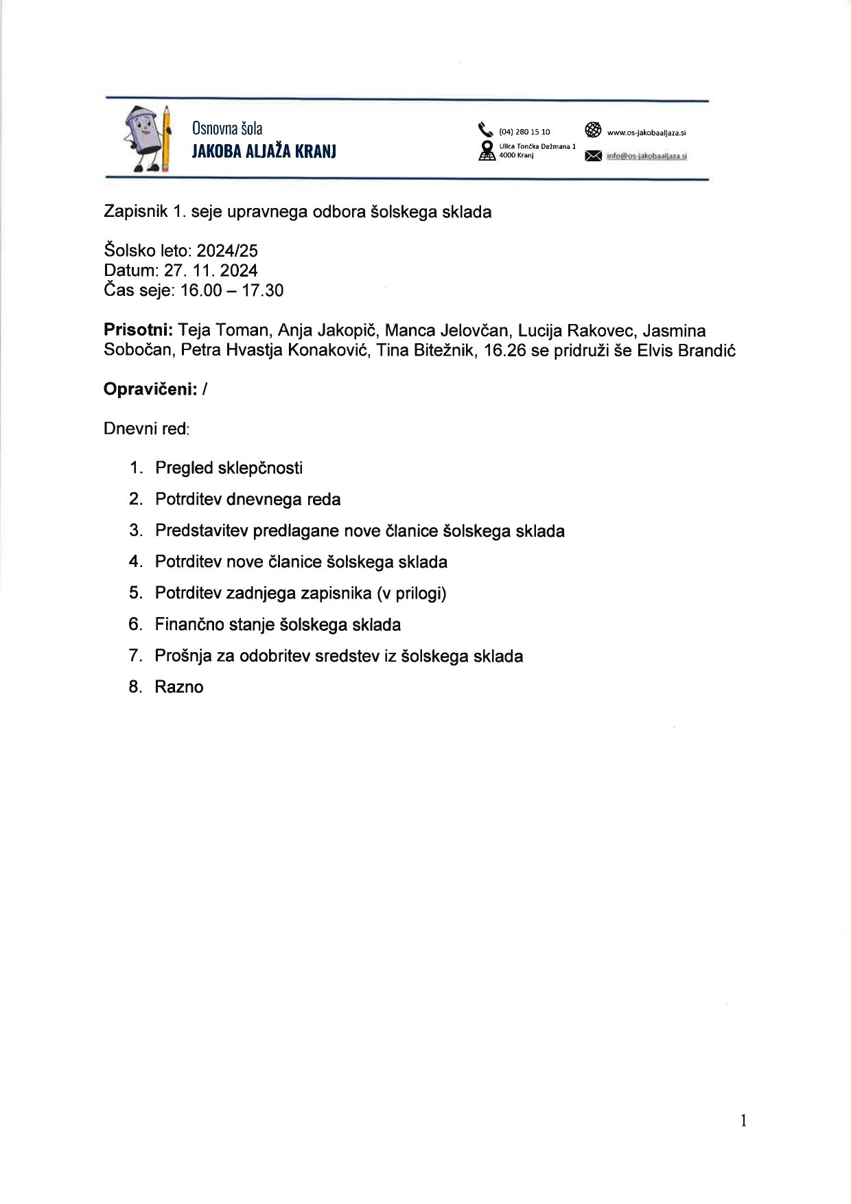 Šolski sklad je bil ustanovljen konec leta 2006. Iz Šolskega sklada se na podlagi 135. člena Zakona o organizaciji in financiranju vzgoje in izobraževanja financirajo dejavnosti posameznega razreda, ki niso sestavni del izobraževalnega programa, oziroma se ne financirajo iz javnih sredstev.